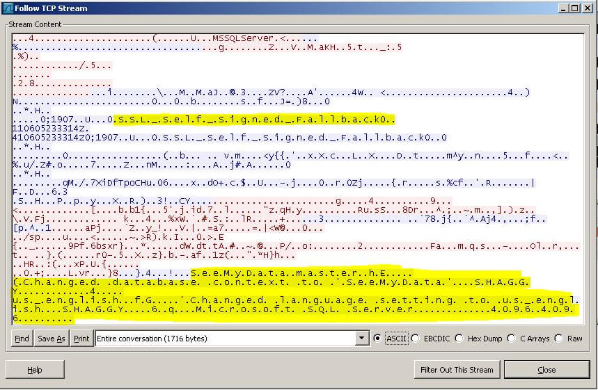 After turning this on, I re-executed the test above and you can see the TCP stream here that I captured. You will find that not only do you not see the username being passed, you cannot pick out anything compared to what you could previously. You should note that I’m only using the self-signed certificate that SQL Server generates. A more secure method would be to apply a certificate to the server from an actual Certificate Authority. This will provide a little deeper encryption and make it a little bit tougher for folks to decrypt your traffic.